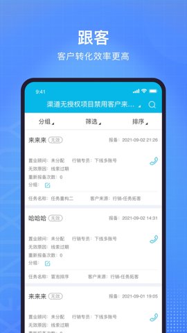3、外场行销专员可以查看内场跟进记录,对客户进行跟进回访,促使客户到访并最终签约;