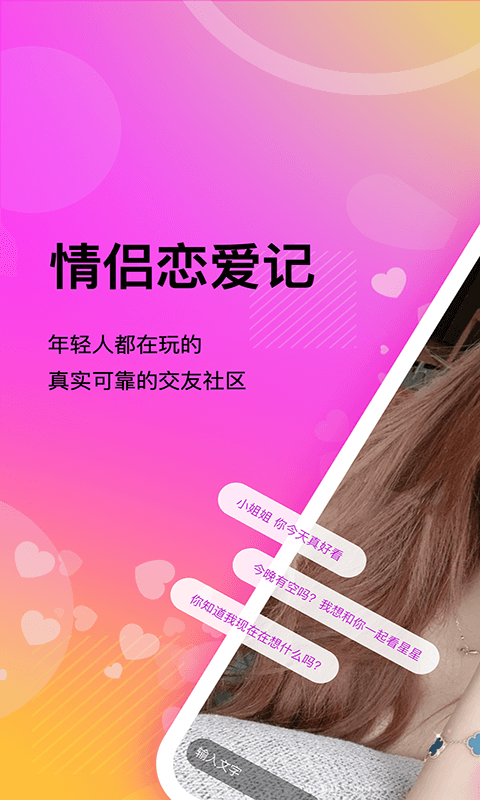 情侣恋爱记是一款专为同城陌生人设计的社交应用,为用户提供一个便捷的互动平台。用户能够轻松找到附近的陌生人进行聊天、交友和约会,开启一段全新的恋爱之旅。无论是想要寻找志同道合的朋友,还是渴望遇见那个特别的TA,这里都能满足各种需求。真实的用户匹配和互动,让每一次交流都充满期待,帮助人们在繁忙的生活中找到属于自己的爱情。