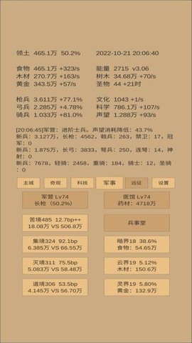 军事:加战力,减少负伤。前期收益就很好。当文化快达到每秒加15的时候,攒科技将军事升到20。(博物馆+兵事堂效益一骑绝尘)。