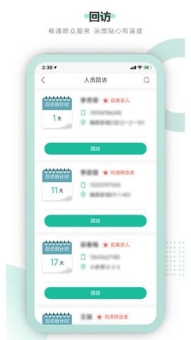 2、特殊人员回访功能,专门针对孤寡老人等特殊群体,提供关怀和帮助,增强社区温暖感。
