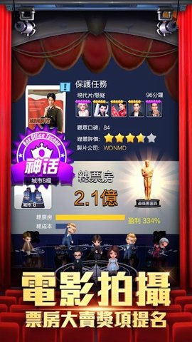 2、首款影视主题模拟游戏王牌制片人可以通过不断的努力将电影发展壮大,打造属于自己的娱乐王国。