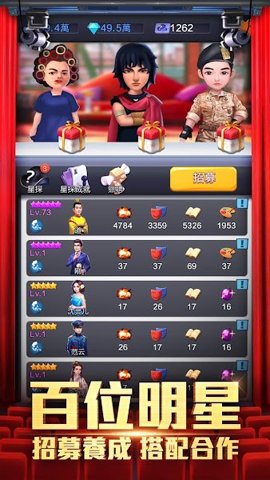 1、玩家可以自由招募近百位明星,涵盖了成熟型、青春型、演技派、偶像派等各种类型,通过悉心培养提升他们的演艺能力和各项属性。