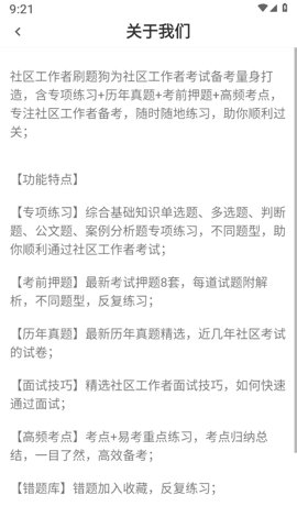 刷题狗app是专为社区工作者考试设计的学习平台,致力于帮助考生们高效备考。这里汇集了历年考试真题,随时在线刷题,轻松应对各类考试。无论你是刚开始备考还是临近考试,刷题狗都能为你提供丰富的学习资源和练习机会,帮助你更好地掌握知识点,提升考试信心。
