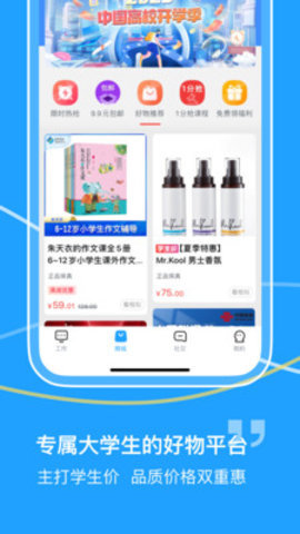 【商城】专属于大学生的好物平台。联合企业为大学生提供优质的商品,各种好物应有尽有。各种寝室好物、拼团活动专属学生价、内部隐藏优惠券、品质的保障以及送货到寝服务,能让你享受独家的优惠与服务,少花钱多购物。