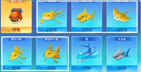 接下来出场的是稍微有点普通,没有特殊能力,却身怀宝藏的黄金家族。黄金鲲,黄金大白鲨都是这一家族的成员。它们最特别的是部分黄金鱼身上藏着奖券,击杀后,不仅可以获得高昂的金币奖励,还可以获得大量的奖券。并且想要寻找海神宝藏,需要捕获黄金鱼作为敲门砖哦!