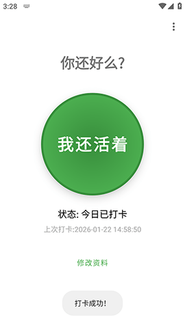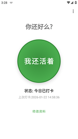 2、完成信息填写进入主界面,点击中央显眼的我还活着按钮,即可完成一次当日的安全打卡。