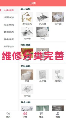 智慧才能社区维修是一款便捷的社区维修应用,根据自身需求选择适合的维修分类,精准获取所需服务。智慧才能社区维修APP为社区的用户朋友提供各种维修项目服务,涵盖水电、家居、墙面管道等多个方面,汇集了专业的师傅为用户提供服务。维修分类详细,支持在线预约,师傅可根据预约上门服务。用户如果具备相关技能,可以在此平台入驻来接单。