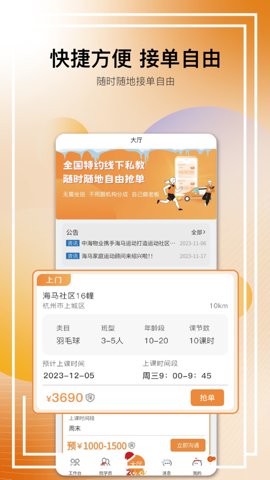 海马教练局app是一款专为私教打造的线下接单平台,旨在为教练们提供一个自由灵活的教学环境。无论你是刚入行的新手教练,还是经验丰富的健身专家,这款应用都能帮助你轻松接单,带课赚钱。你可以随时随地选择合适的课程与学员进行交流,甚至支持上门授课,极大地方便了教练的工作安排。通过海马教练局,你将拥有自己的客户群体,真正实现“自己做老板”的梦想。