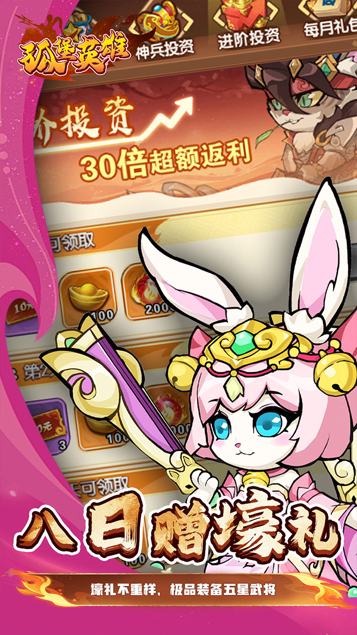 孤堡英雄是一款以三国为背景的全新放置卡牌游戏,玩家将体验到全新的策略布阵玩法。游戏融合了放置挂机与卡牌培养的元素,玩家可以轻松地安排自己的武将阵容,并通过挂机系统自动获取资源,轻松享受游戏带来的乐趣,给玩家带来了一种全新的三国体验,海量的福利和呆萌可爱的武将也在等待着玩家的探索。