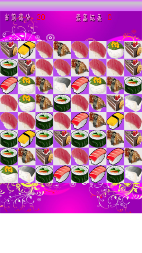 交换寿司:玩家可以点击两个相邻的寿司,使它们交换位置。如果交换后能够连成一条直线的相同寿司,们将被消除并得分。