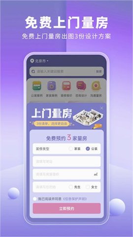 2、支持一键预约上门量房,专业设计师会在约定时间到达,为用户提供精准的量房服务。
