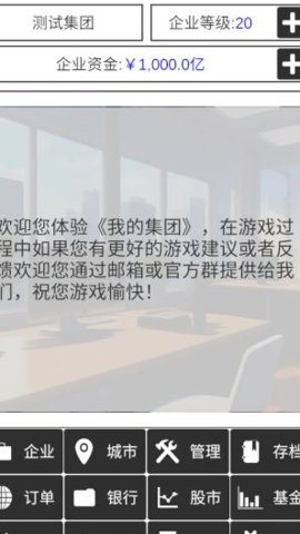 在《我的集团》中,玩家将化身为一位商业巨头,体验从零开始建立自己的企业王国的过程。游戏以文字为主,玩家需要通过精明的决策和战略眼光来买地扩张、建设厂房、招募人才、投资项目,逐步构建繁荣的商业帝国。每一个选择都将影响企业的未来发展,玩家在游戏中不仅要关注资金的流动,还要洞察市场的变化,抓住每一个商业机会。通过设立办公大楼、购物中心等,玩家能够增加租金收入,逐步积累财富,体验到创业的乐趣与挑战。