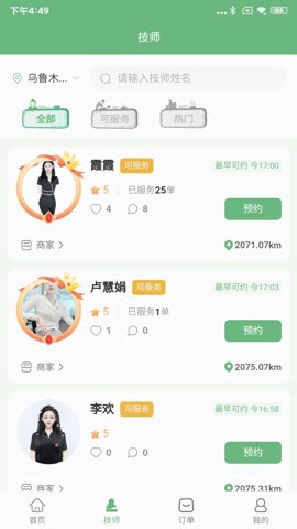 3、支持根据用户所在城市位置查找附近技师,确保用户能够享受到就近的优质服务,减少等待时间。