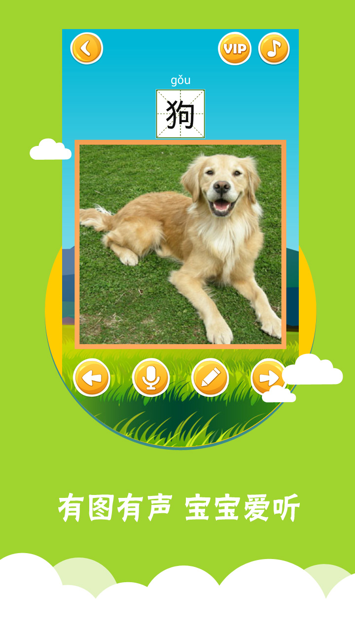 2、进入具体课程,画面中央会显示一个大大的汉字或词语,伴有自动播放的读音,孩子可以观察旁边的配图。