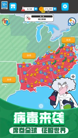 野蛮生长模拟器是天津微色科技有限公司开发的一款引人入胜的养成游戏,玩家在扮演病毒的制造者,通过模拟经营的方式让病毒快速裂变,最终席卷整个漂亮国。游戏的核心玩法是通过发挥智慧,将病毒传播给全球的人类,实现真正的毁灭世界的目标。