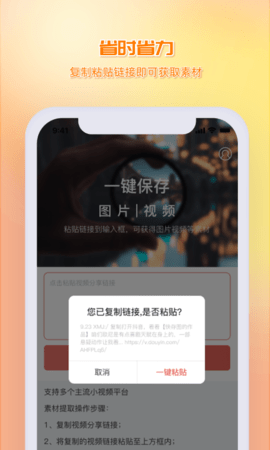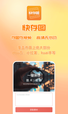 快存图是一款快捷方便的存图工具应用,其核心功能主要包括一键保存视频、图片和文案素材。用户只需复制链接并粘贴到快存图中,即可轻松获取链接中的无水印视频、高清图片和文案素材。用户可以方便地去除水印、保存高清图片,以及一键复制文案,极大地简化了素材获取的流程。