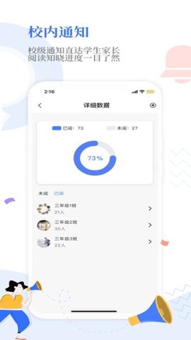 2、校园应用支持校级通知直达学生家长,让阅读进度一目了然,提供简洁的班级信息公告,避免家长信息过载。