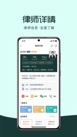 4、律师个人主页,查看律师的执业证书、专业领域、过往案例等信息,帮助用户做出更好的选择。