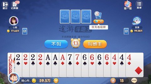 2.发牌与叫地主:游戏开始,系统自动发牌(每人17张,留3张底牌)。玩家轮流叫分(1、2、3分)或不叫,分高者成为地主,并获得底牌。