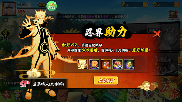 3、累计登录送漩涡鸣人-九喇嘛直升10至12星