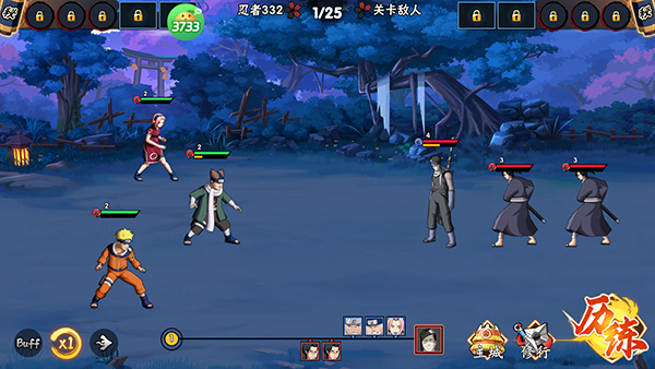 忍者分体术、忍术、幻术、治疗、控制五大定位,搭配风、林、火、山属性克制,站位分前排、中排、后排。
