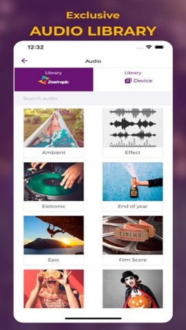 4、内置丰富的音频库,包含适合各种场合的音乐,帮助用户为作品增添完美的音效。