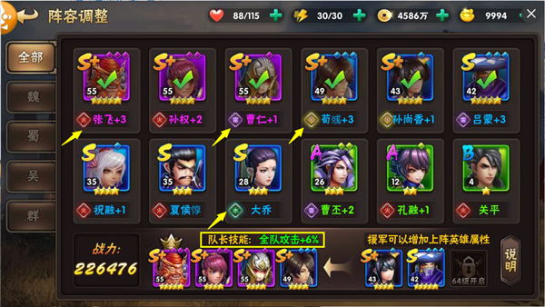 2、每个武将均有对应的队长技能,若你崇尚输出碾压,建议使用输出型武将作为队长,若喜欢固若金汤,可以选择防御类武将作为队长。