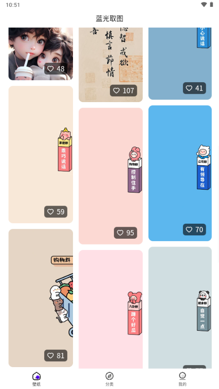 2. 分类智能:节省寻找时间。壁纸和头像按风景、文字、治愈等主题进行智能分类,让用户快速找到自己心仪的内容,省去无谓的寻找时间。