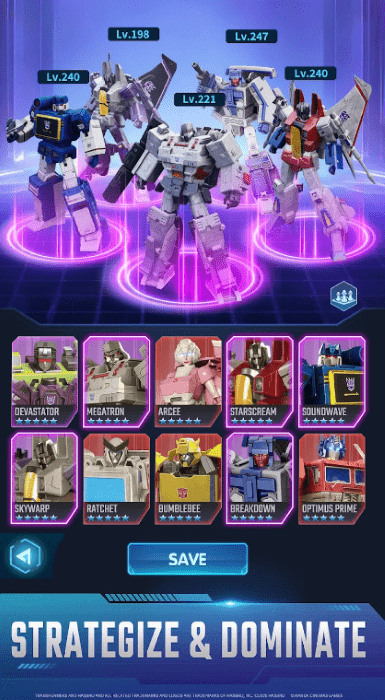 1.自由组合变形金刚角色,每个角色都具备独特的技能和特性,合理的搭配将是胜利的关键。
