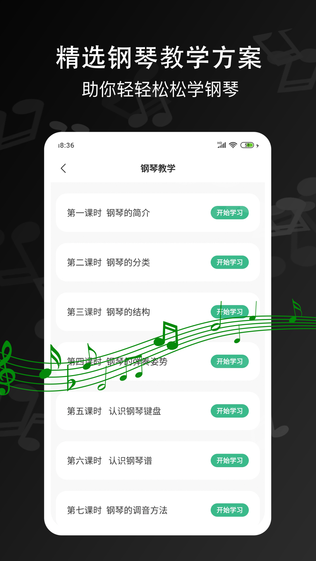 5. 多维度钢琴教学:提供系统化的教学内容,帮助零基础的用户快速入门,逐步掌握钢琴演奏技巧。