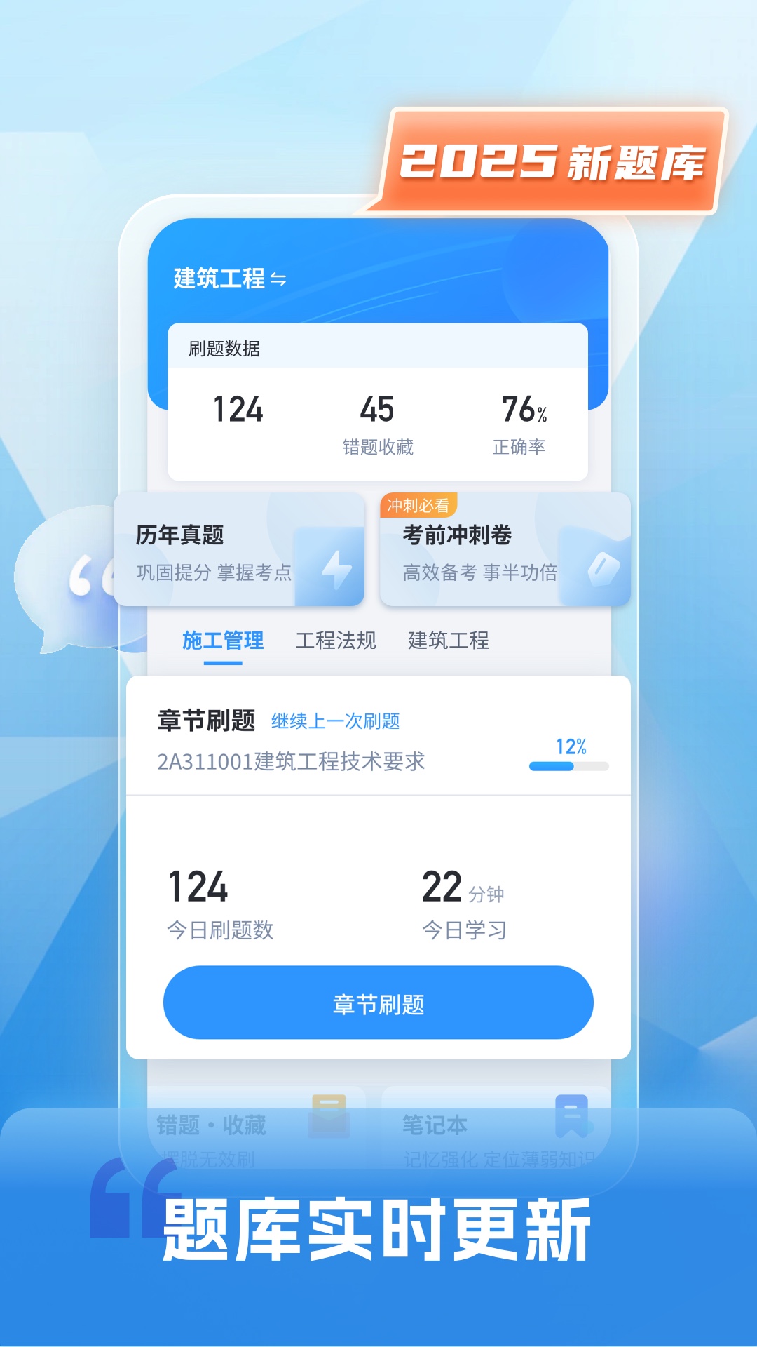 二级建造师题库自考王是一款专为备考二级建造师考试的考生打造的学习软件。它根据2025新版考试大纲出题,内容紧跟教材,涵盖了建设工程施工管理、建设工程法规及相关知识和专业工程管理与实务三大科目。软件内不仅提供了历年考试真题,还汇集了名师精选题目,帮助考生迅速掌握考试必考知识点,提升备考效率,确保顺利通过考试。无论是建筑、公路、水利水电、市政、矿业还是机电等专业类别,软件都能为考生提供全面的学习支持。
