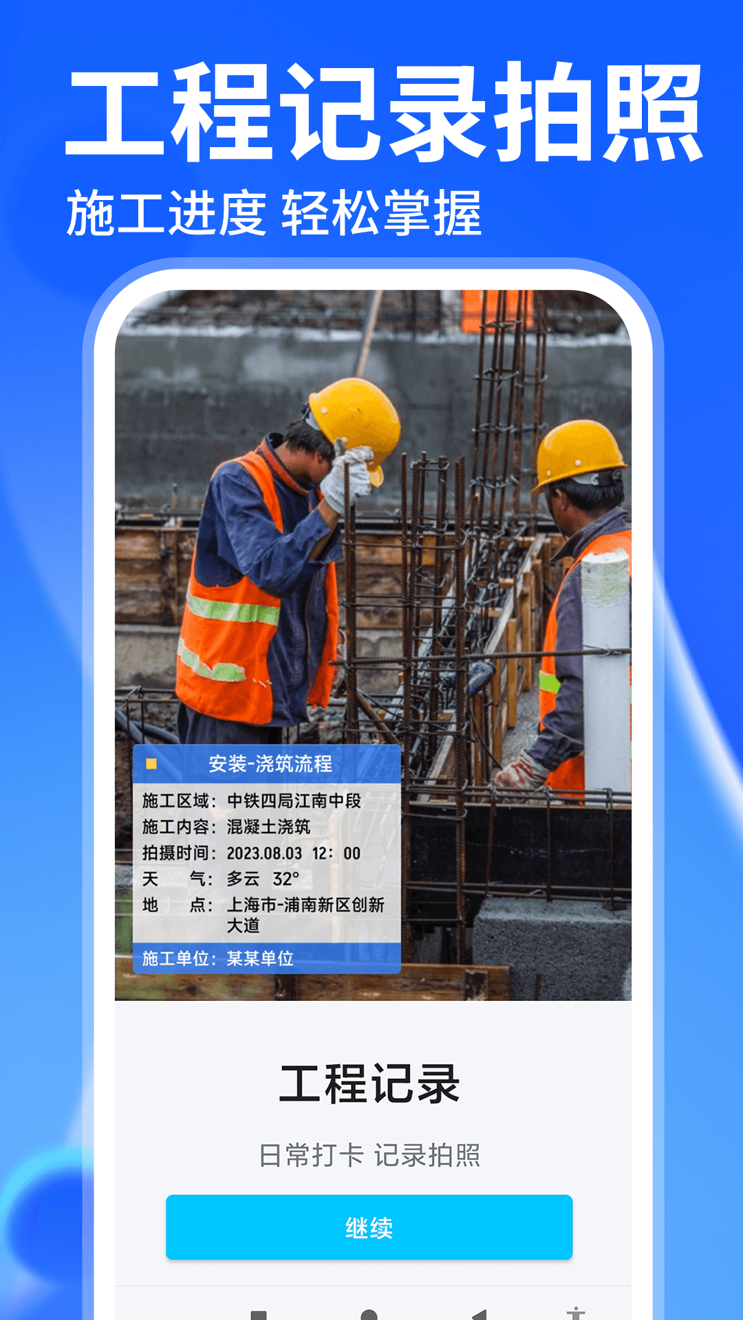 3. 工程水印功能:专为工程施工管理设计,在照片中添加工程名称、方位角、建设单位等信息,便于后期资料整理与审核。