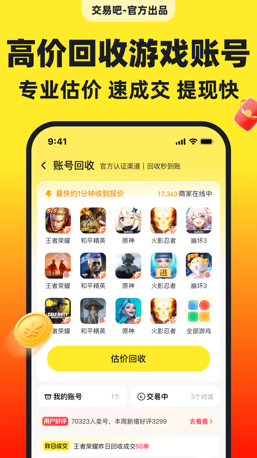 交易吧是一款专注于游戏账号交易的平台,为广大玩家提供一个安全、便捷的交易环境。无论是想要出售闲置游戏账号,还是希望购买心仪的游戏角色,交易吧都能满足用户的需求。通过平台,用户能够轻松找到合适的买家或卖家,解决交易过程中的信任问题,确保每一笔交易都能顺利进行,带来愉快的交易体验。
