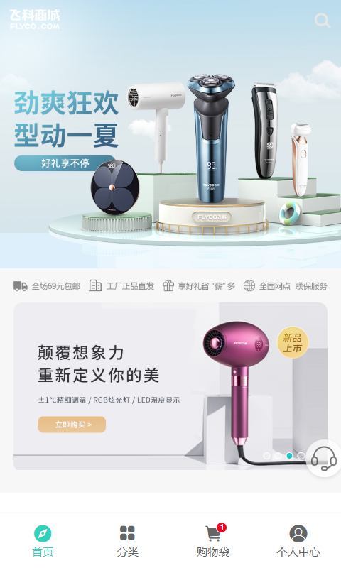 1. 打开飞科商城,进入首页后可以看到各类产品的分类,选择您感兴趣的类别。