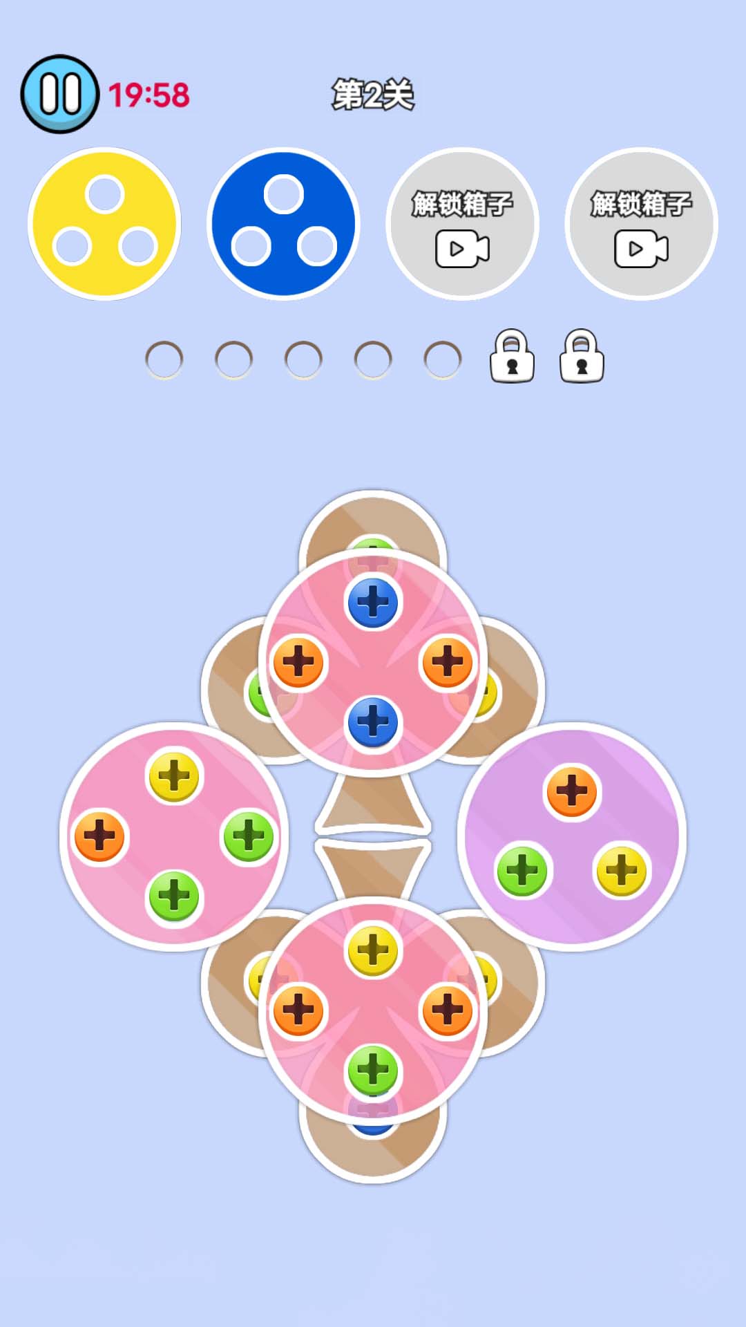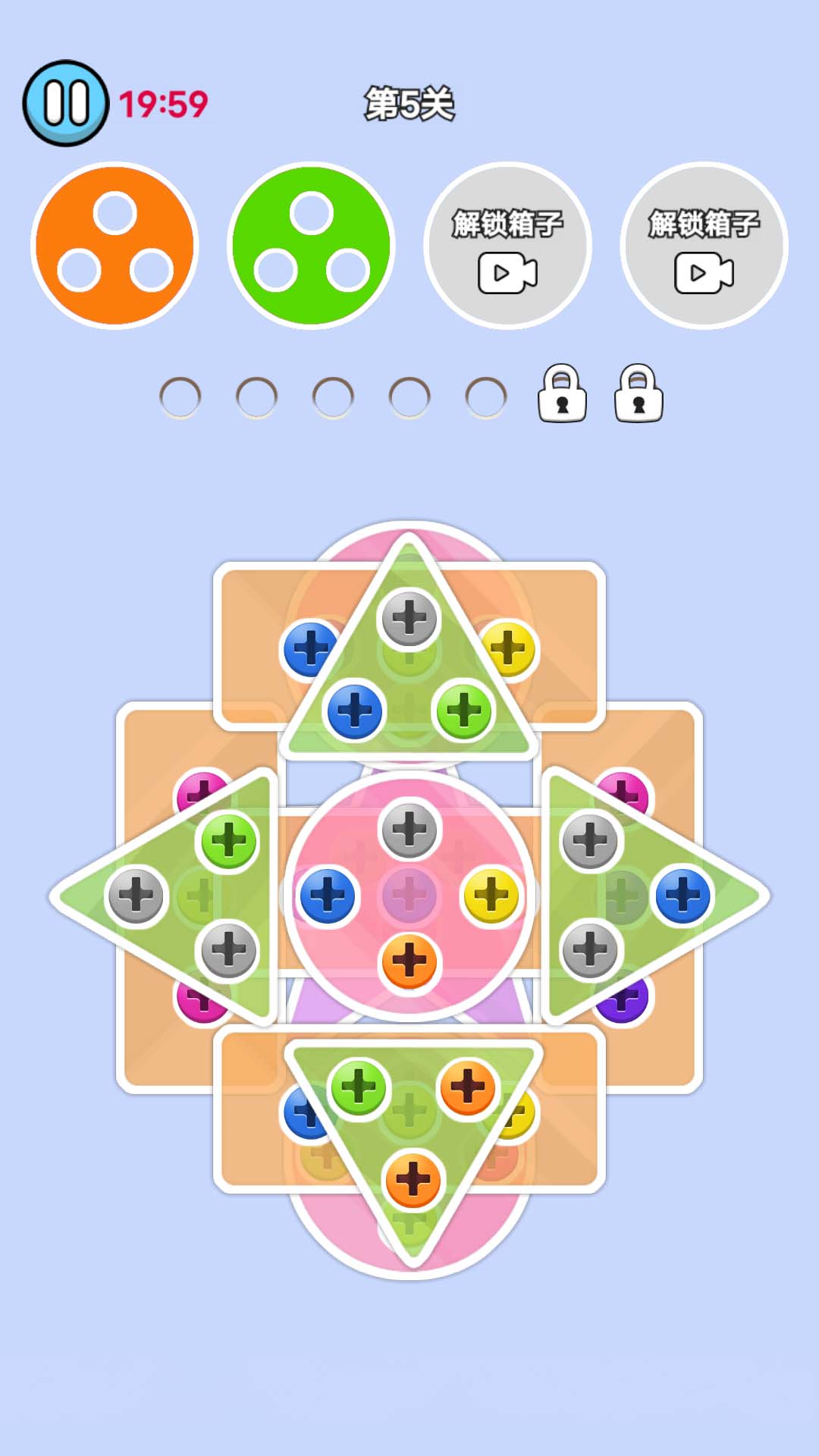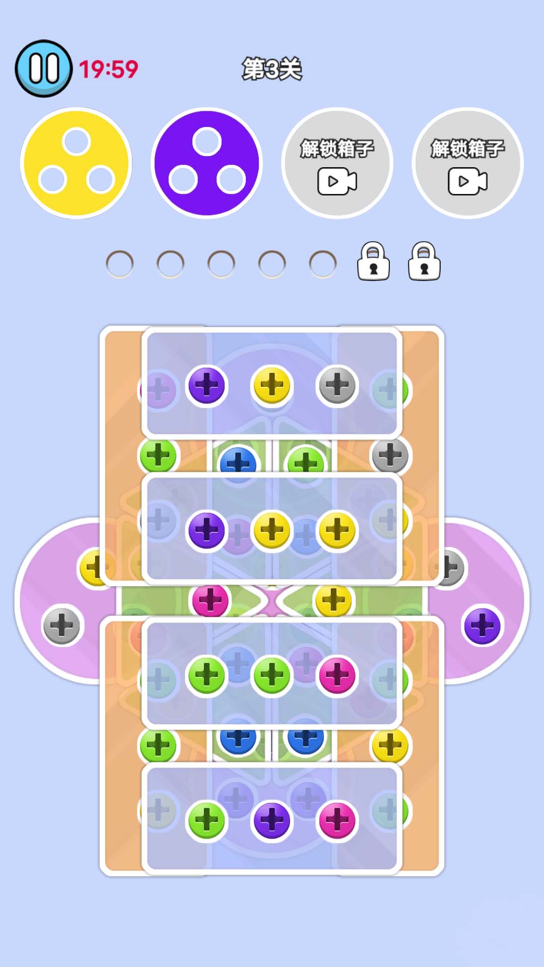 3、在关卡中,玩家需要注意不同颜色螺丝的排列,合理规划消除顺序,以实现更高的分数和更快的通关时间。