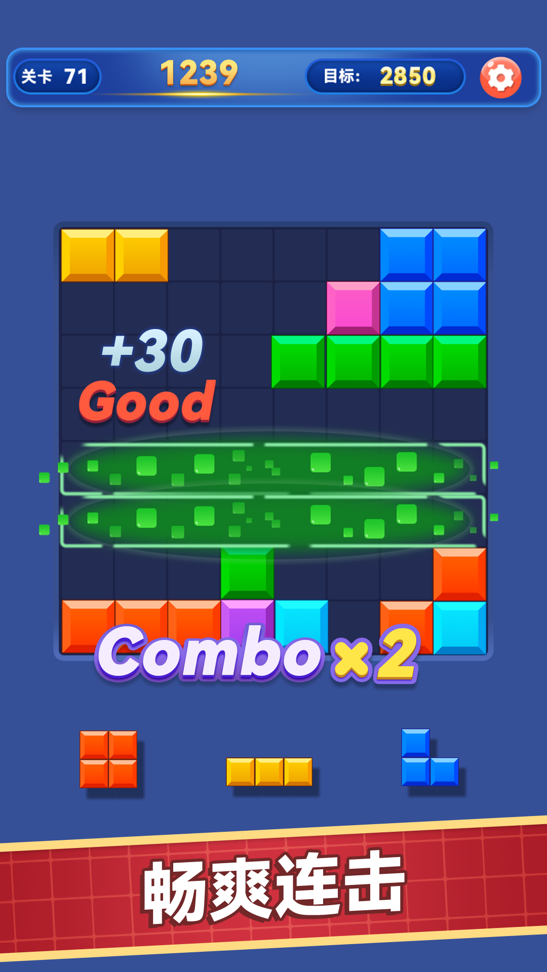 2、在每一关中,玩家需要根据方块的颜色和形状进行合理的组合,才能有效消除更多的方块,积累更高的分数。