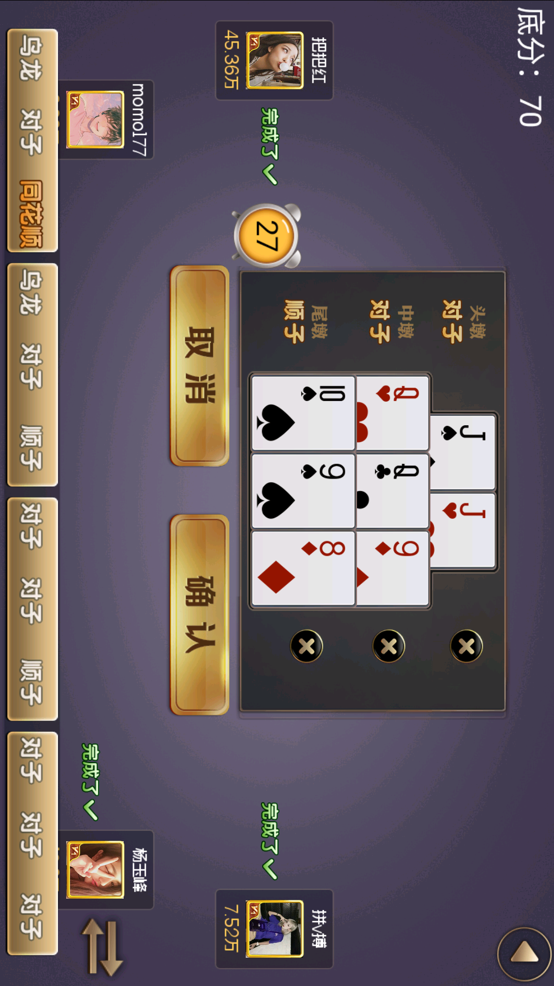 3、智能化摆牌功能,不仅提高了游戏的效率,还帮助玩家更好地理解牌型组合,适合不同水平的玩家。