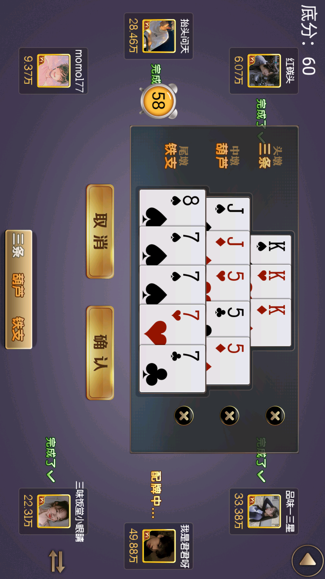 3、智能化的摆牌界面大大提升了游戏的流畅性,帮助玩家快速完成牌型组合,减少了操作时间,使游戏更加高效。