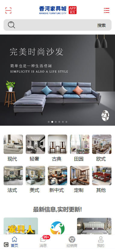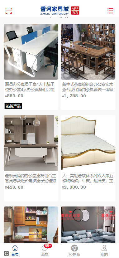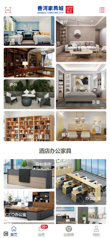 1. 打开香河家具城应用,您将看到主界面,包含多个功能模块。