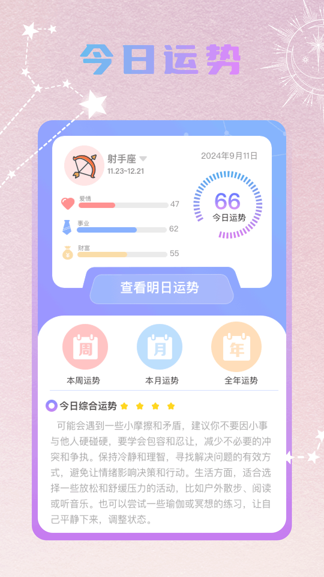 3. 凭借精准的星座分析,用户能够在爱情、事业和财运等多个方面获得个性化的指导,提升生活质量。