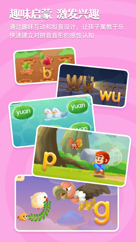 3. 每个拼音教学环节都融入了趣味互动元素,结合动画和触控操作,让孩子在3秒内迅速进入学习状态,提升他们的主动学习兴趣。