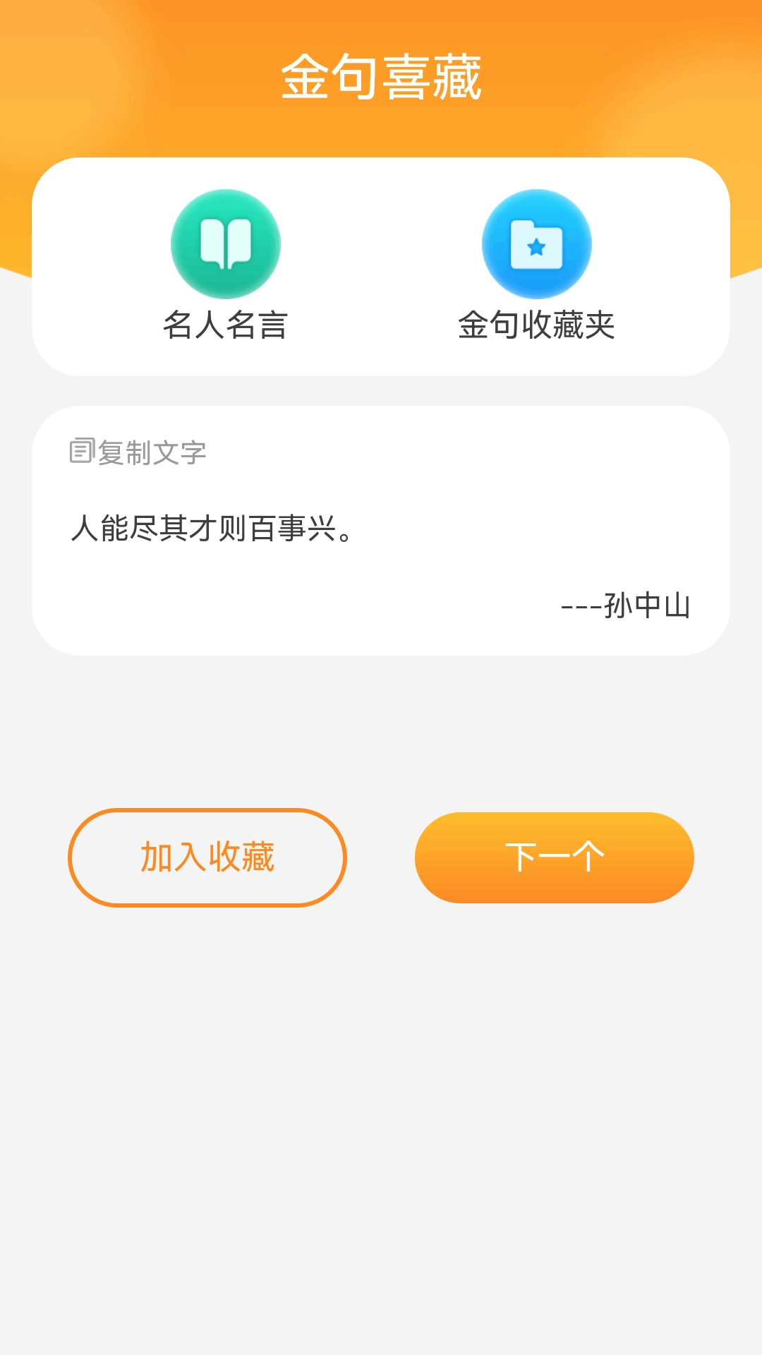 4. 进入名人名言板块,浏览精选的名言,您可以将喜欢的句子收藏。
