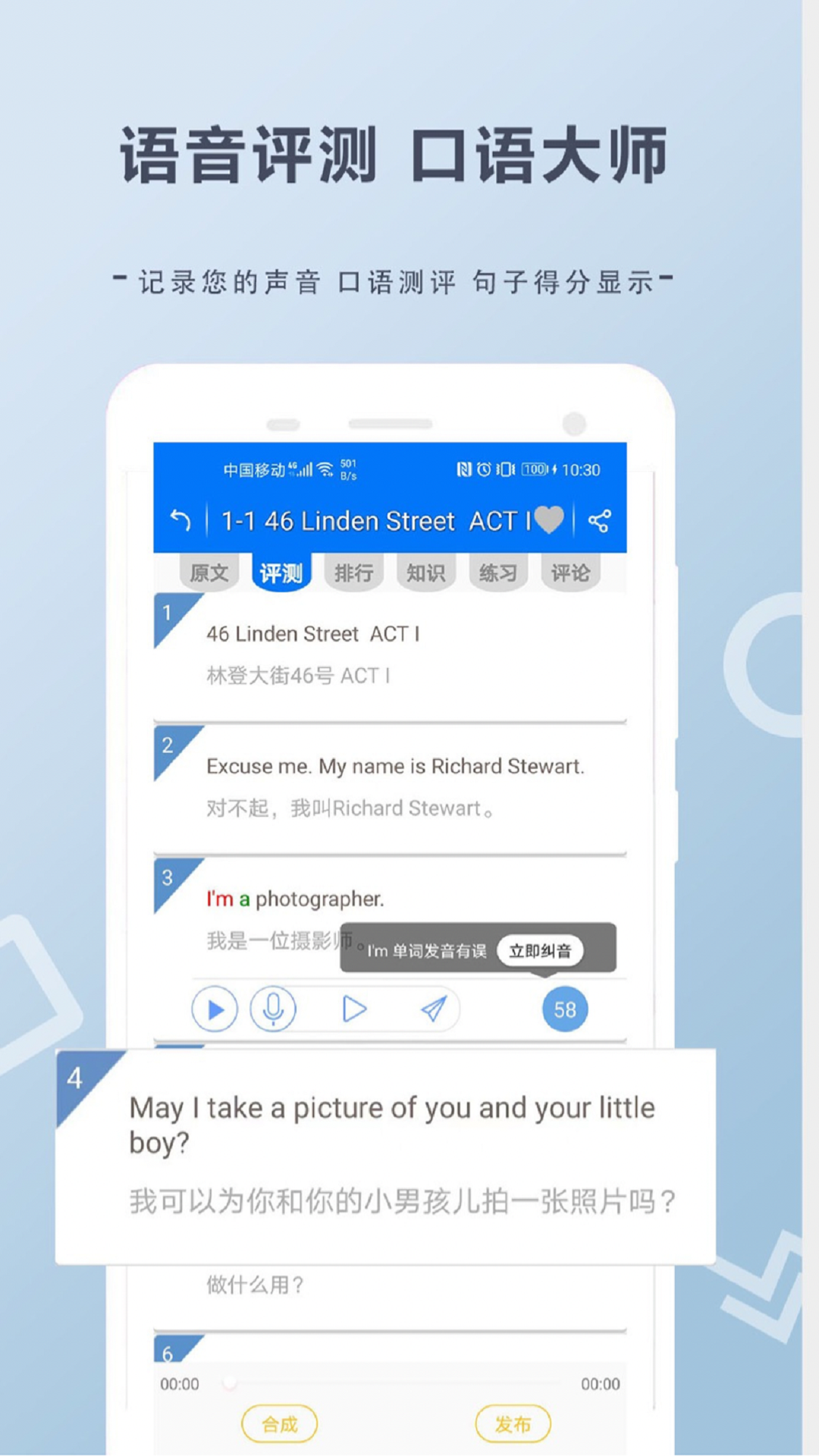 1. 语音评测模块让通过录音跟读的方式,实时获得口语评分,帮助提高发音和语调的准确性。