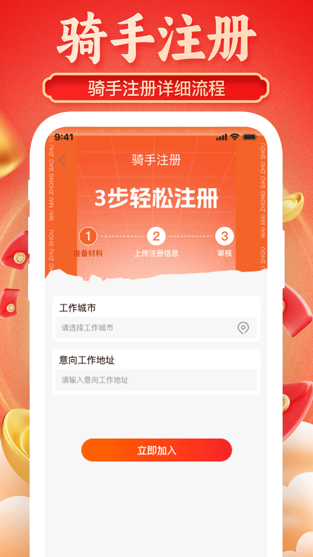 1、注册流程指导模块,提供详细的步骤说明,帮助骑手轻松完成注册,确保每位骑手都能顺利进入外卖行业。