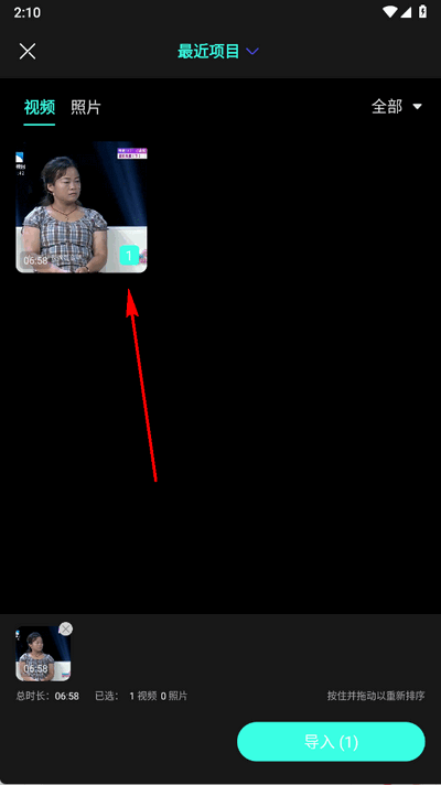 2、在素材库中浏览并选择需要编辑的视频文件,点击导入将视频添加到项目中。