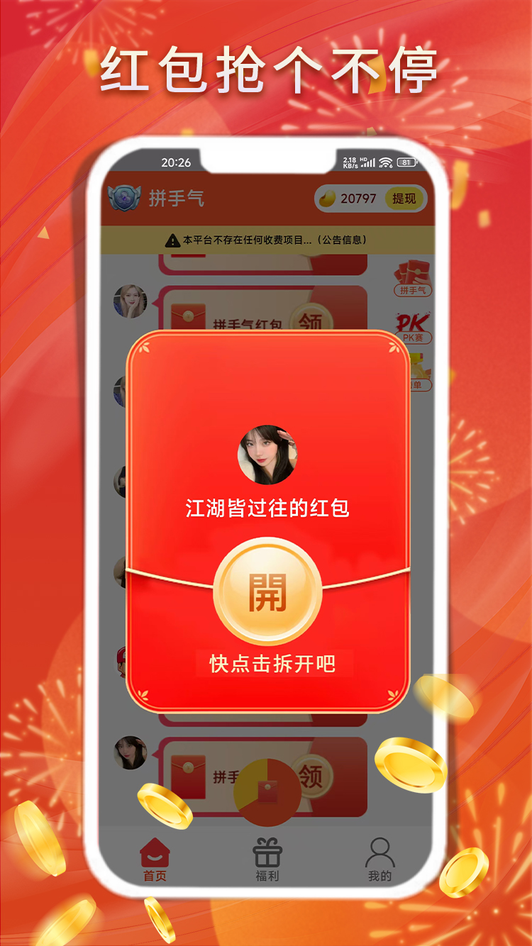 2、平台提供多样化的红包玩法,选择经典、PK赛和拼手气等不同模式,满足不同用户的需求与喜好。
