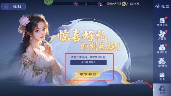 然后在弹出的界面点击兑换,输入兑换码,领取豪华礼包