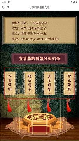 3、用户将看到自己的命盘详情,点击智能分析后,可以获取到更加详细的命理分析内容。
