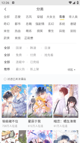 4、支持多种类型的筛选功能,帮助你快速定位到自己最喜欢的漫画类型。