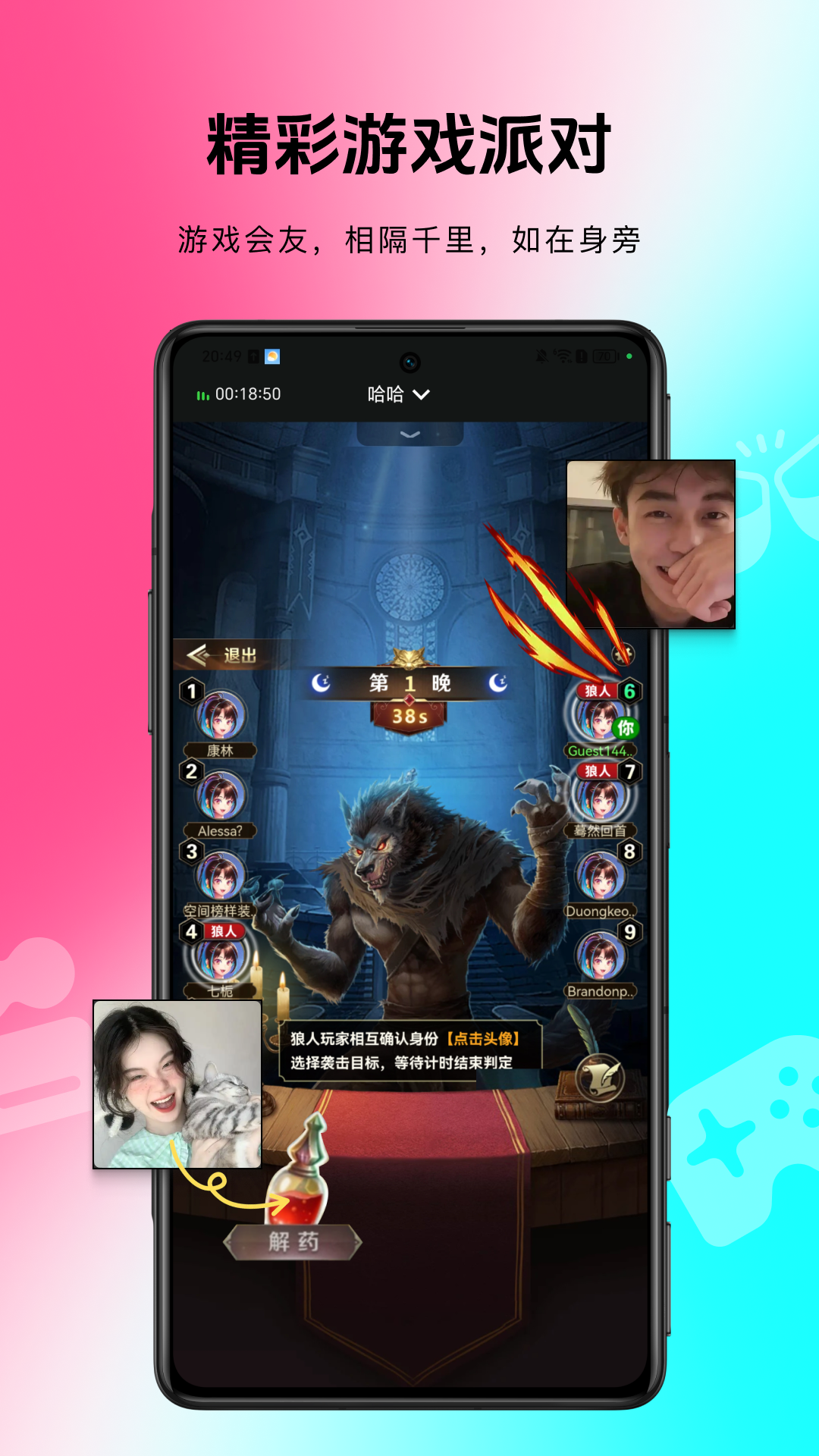 2、平台内置数十款热门互动游戏,自由选择,组织游戏派对,享受与好友同乐的乐趣。